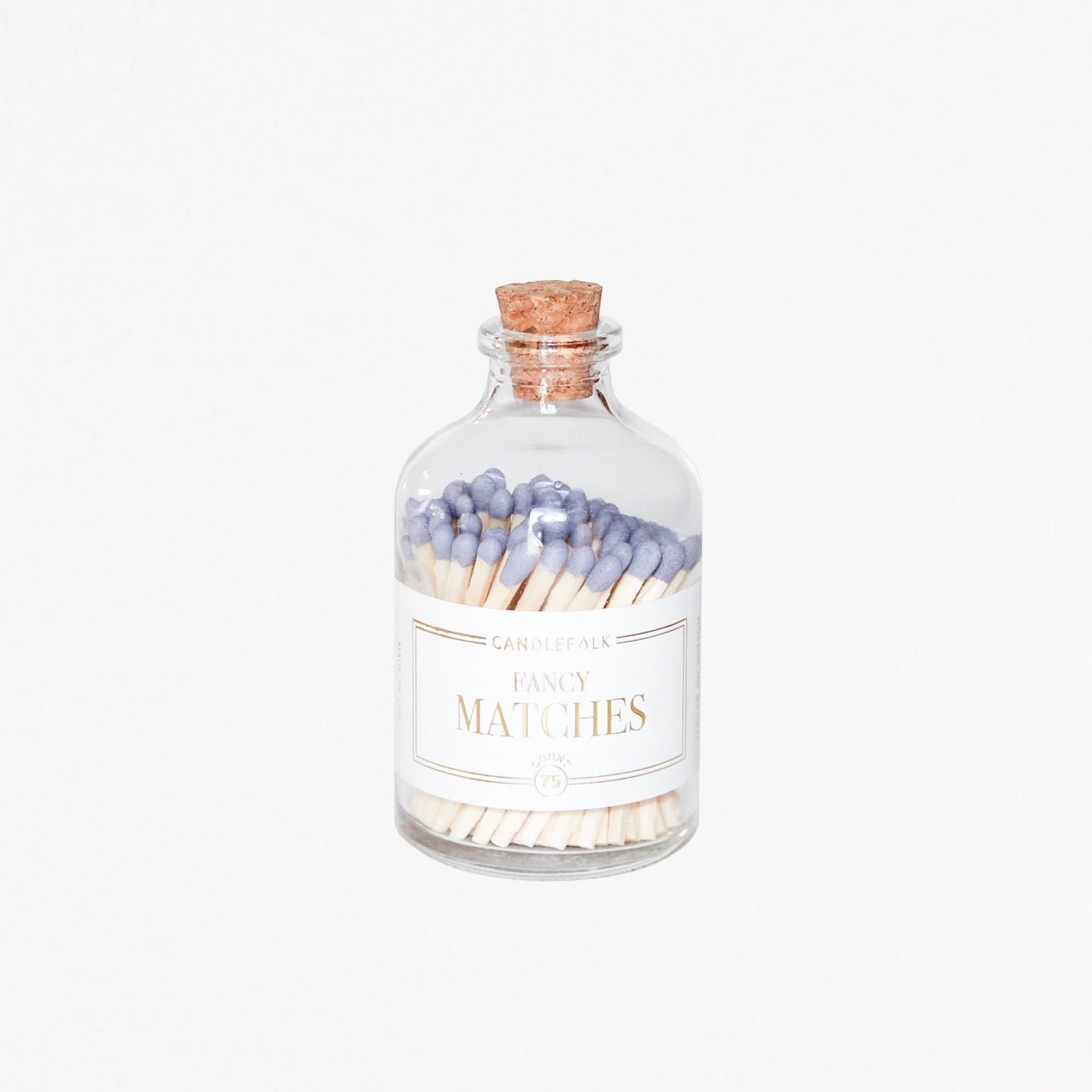 Colored tip matches in an apothecary-inspired glass bottle with a cork top and a striker on the bottom. Approximately 75 matches included.