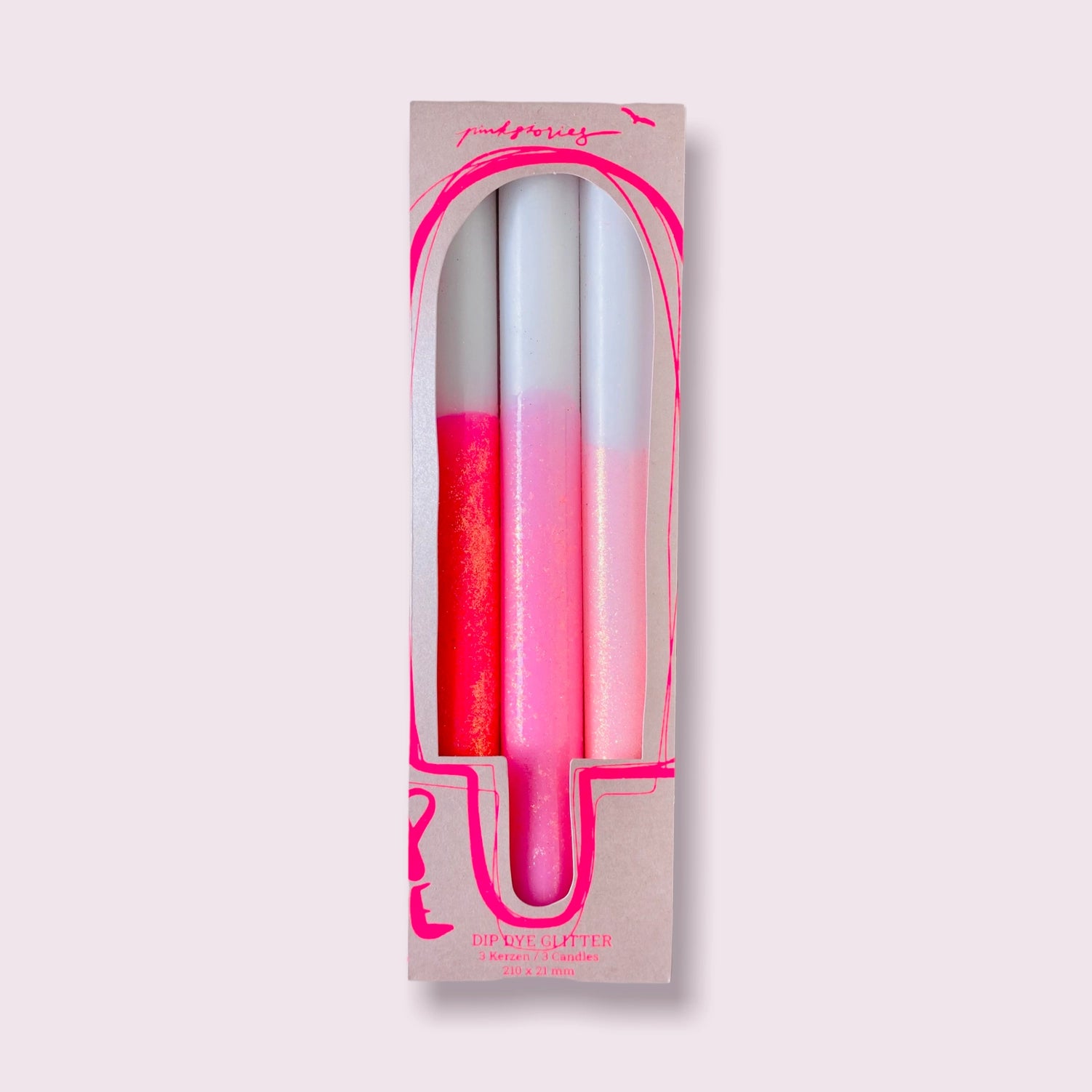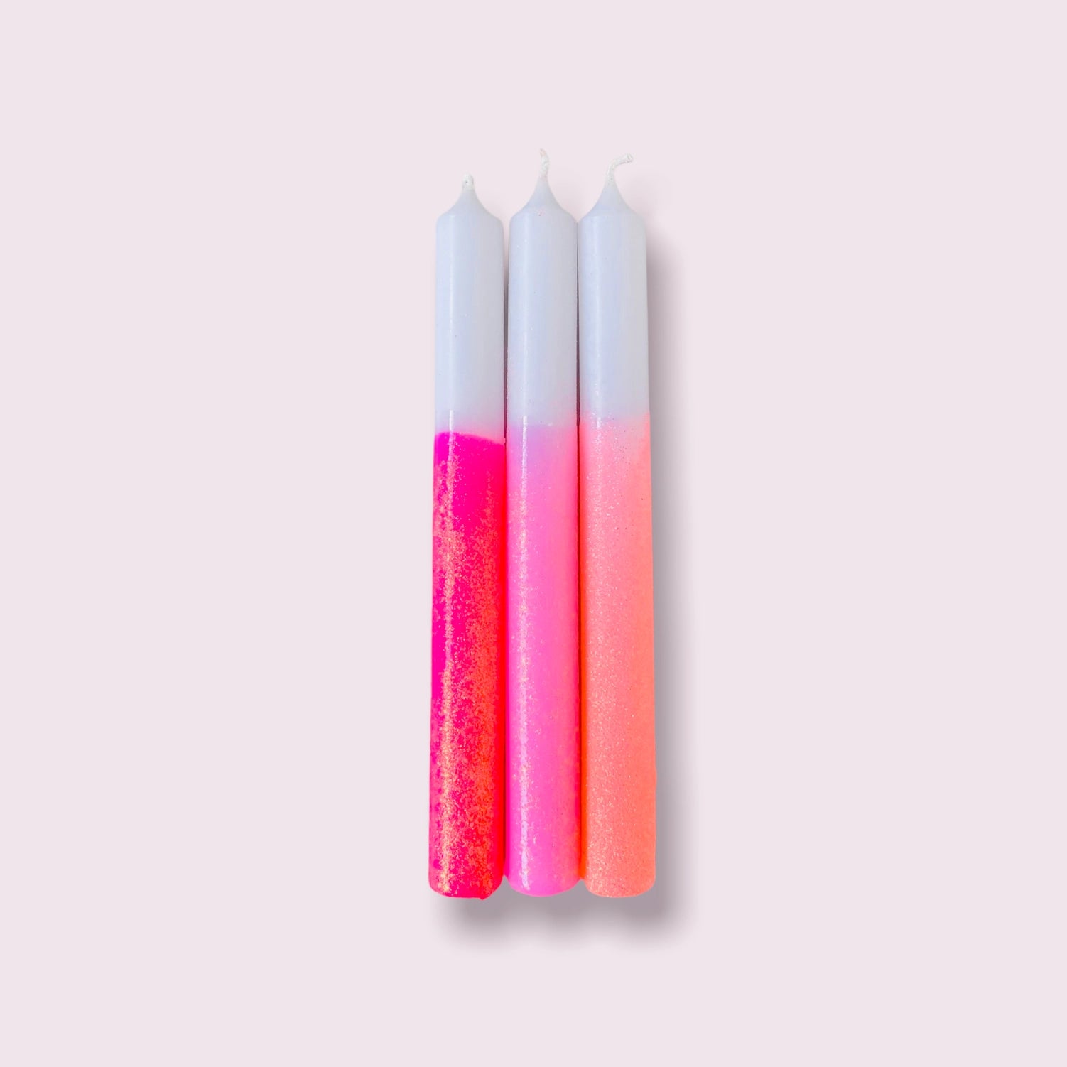 Lovingly dipped candles in glitter look made from carefully chosen paraffin. Set of three packed in a high quality box with neon embossing.