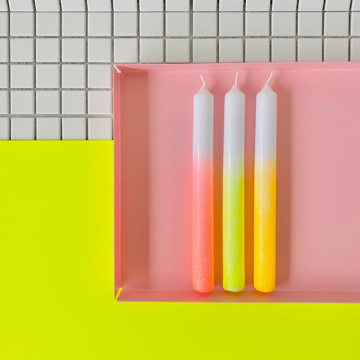 Lovingly dipped candles in glitter look made from carefully chosen paraffin. Set of three packed in a high quality box with neon embossing.