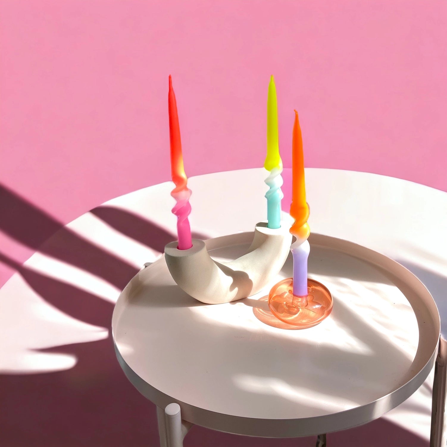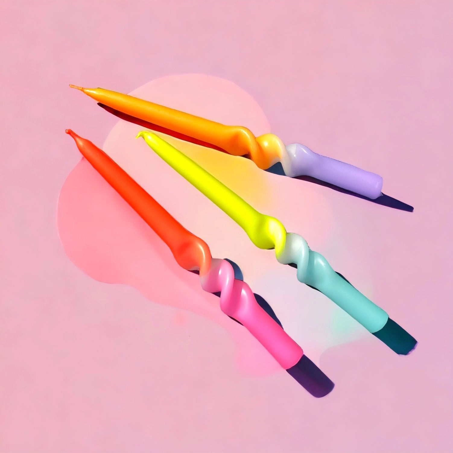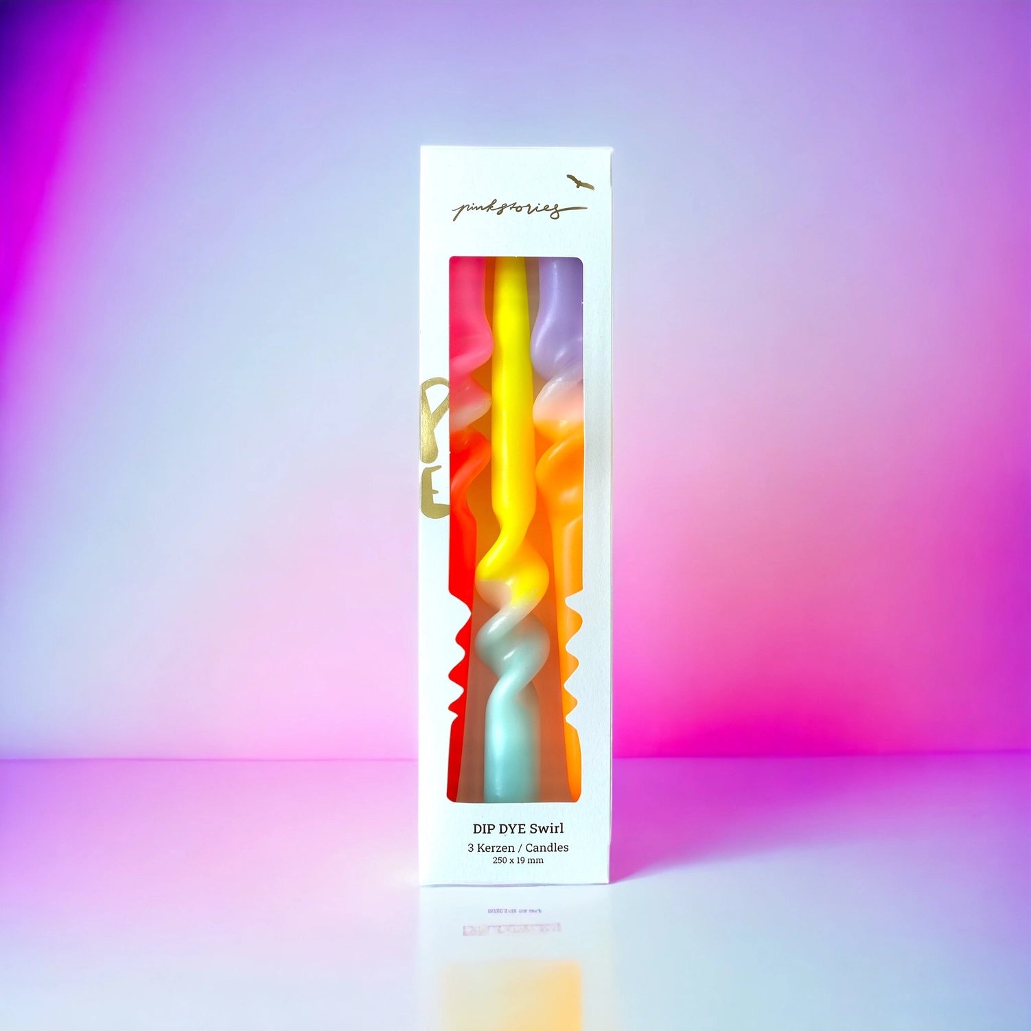 Set of three lovingly hand-dyed, hand-turned stick candles in neon look. The colors remain the same, the pattern gradients vary with each candle and make them a special one-of-a-kind.